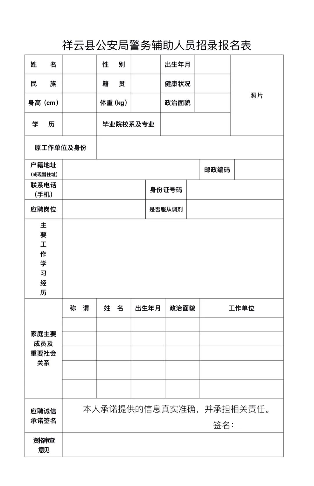 3.報(bào)名方式:本次招聘采取本人現(xiàn)場(chǎng)報(bào)名形式開(kāi)展,不接受他人代報(bào),應(yīng)聘人員報(bào)名前應(yīng)仔細(xì)閱讀招聘公告,真實(shí)填報(bào)《祥云縣公安局警務(wù)輔助人員招錄報(bào)名表》(自行下載報(bào)名表)。