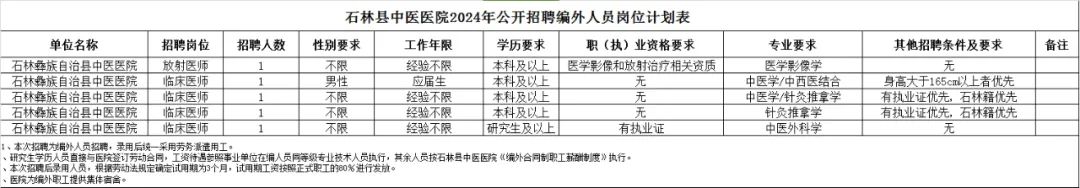 向社會(huì)公開招聘具有教育行政主管部門認(rèn)可學(xué)歷并符合招聘條件及崗位條件的人員,具體要求詳見《石林縣中醫(yī)醫(yī)院2024年公開招聘編外人員崗位計(jì)劃表》(附件1)。