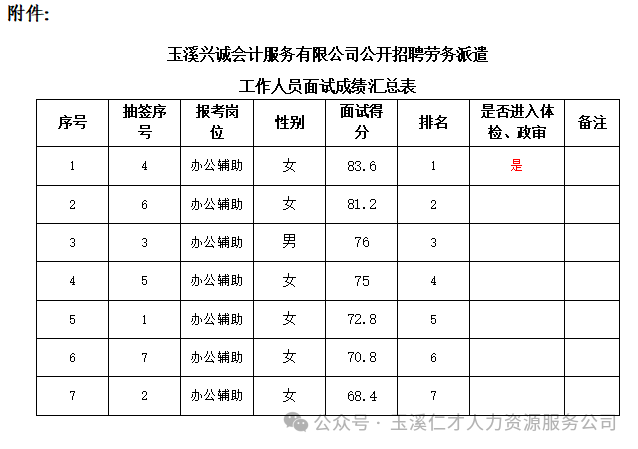 玉溪興誠會計服務有限公司公開招聘勞務派遣工作人員面試成績公示