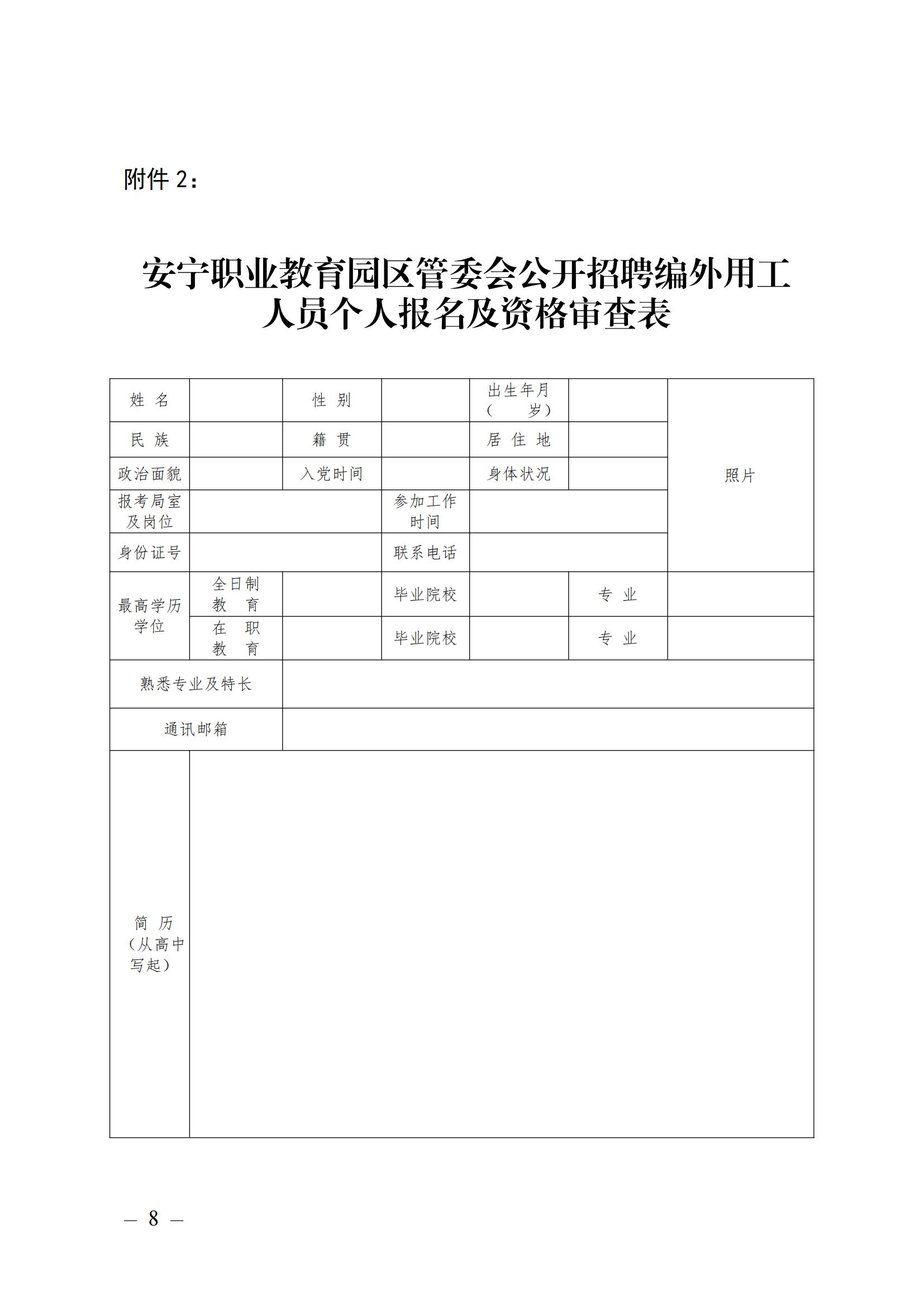 2.安寧職業(yè)教育園區(qū)管委會公開招聘編外用工人員個人報名及資格審查表