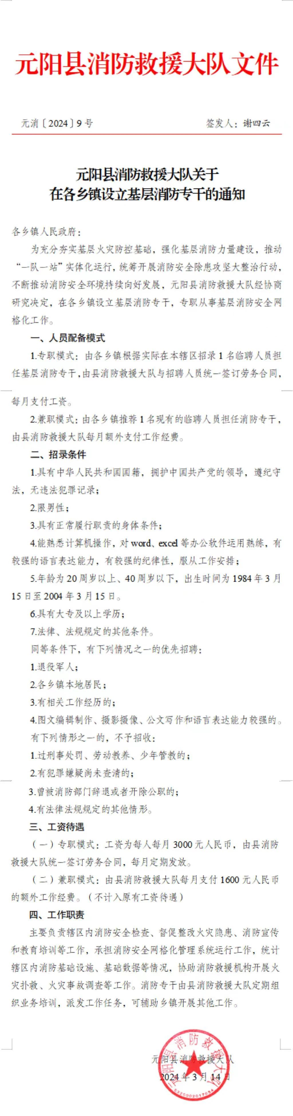 為充分夯實基層火災防控基礎,強化基層消防力量建設,推動“一隊一站”實體化運行, 統(tǒng)籌開展消防安全除患攻堅大整治行動,不斷推動消防安全環(huán)境持續(xù)向好發(fā)展,根據(jù)《元陽縣消防救援大隊關于在各鄉(xiāng)鎮(zhèn)設立基層消防專干的通知》(元消〔2024〕9號文件)要求,現(xiàn)招錄1名臨聘人員擔任基層消防專干,專職從事基層消防安全網(wǎng)格化工作?,F(xiàn)將有關事項公告如下: