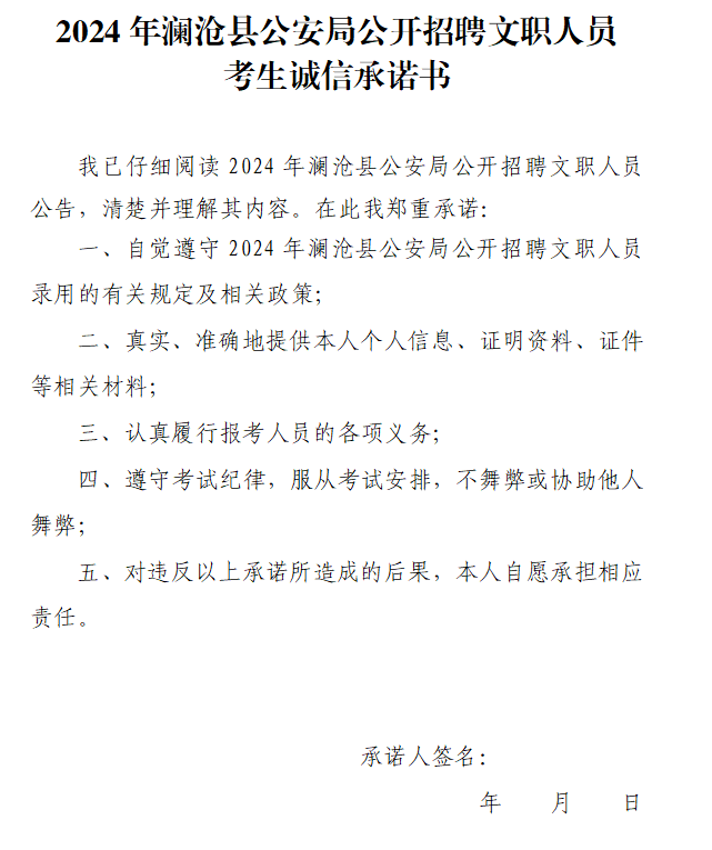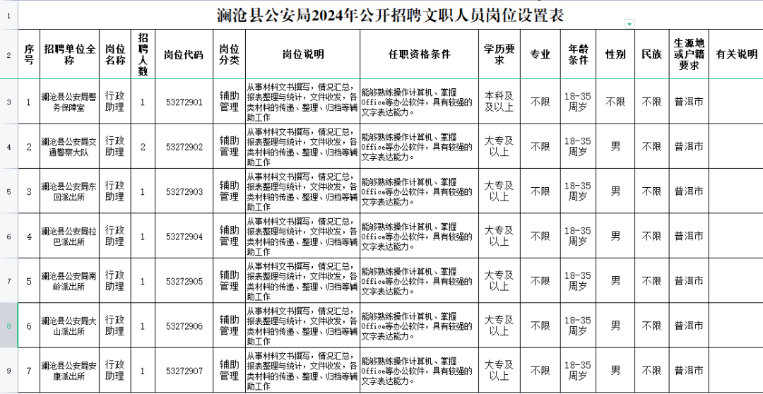 招聘崗位、資格條件詳見《瀾滄縣公安局2024年公開招聘文職人員崗位設(shè)置表》,詳情請關(guān)注“瀾滄警方”微信公眾號進(jìn)行查詢。