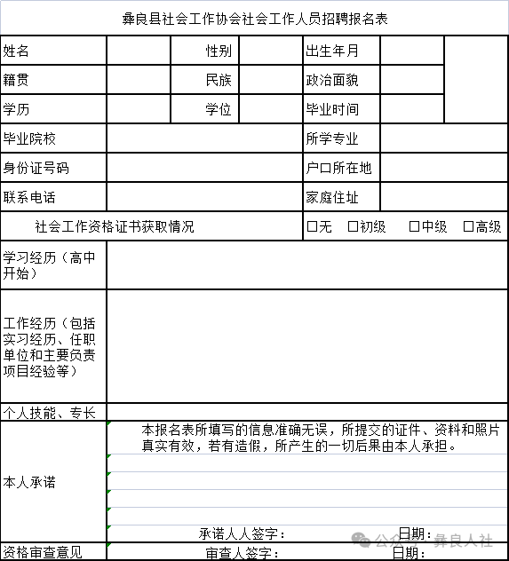 附件:彝良縣社會工作協(xié)會社會工作人員招聘報名表