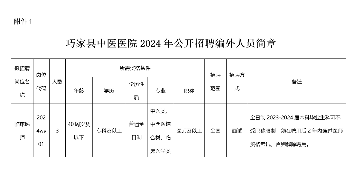 (一)崗位設(shè)置:詳見附件《巧家縣中醫(yī)醫(yī)院2024年公開招聘編外人員簡章》。