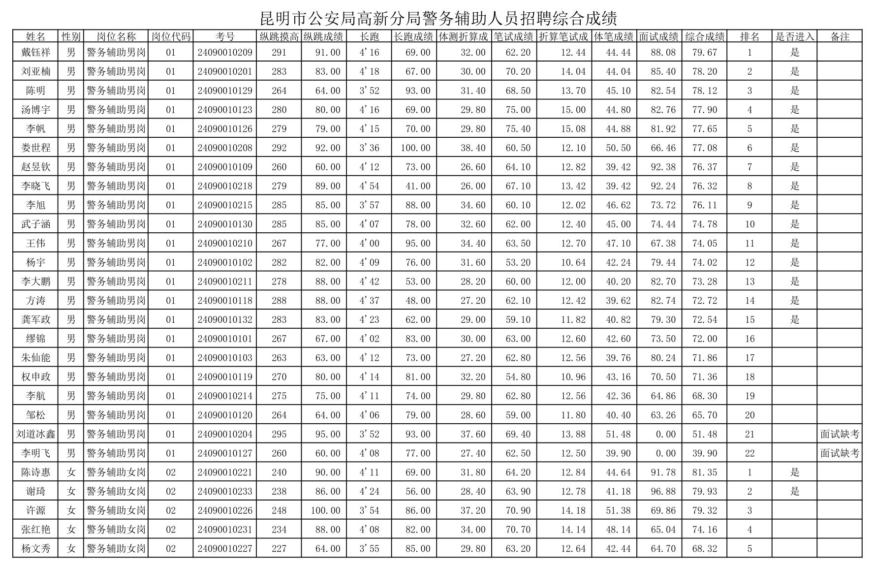 昆明市公安局高新分局2024年公開招聘勤務(wù)輔警面試于2024年3月29日組織完成,按照招聘公告要求,現(xiàn)對面試成績及政審考察公告如下: