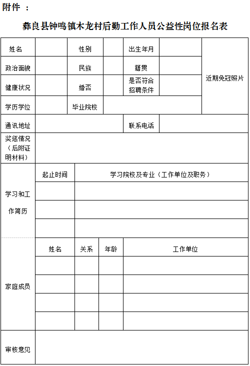 附件:彝良縣鐘鳴鎮(zhèn)木龍村后勤工作人員公益性崗位報名表