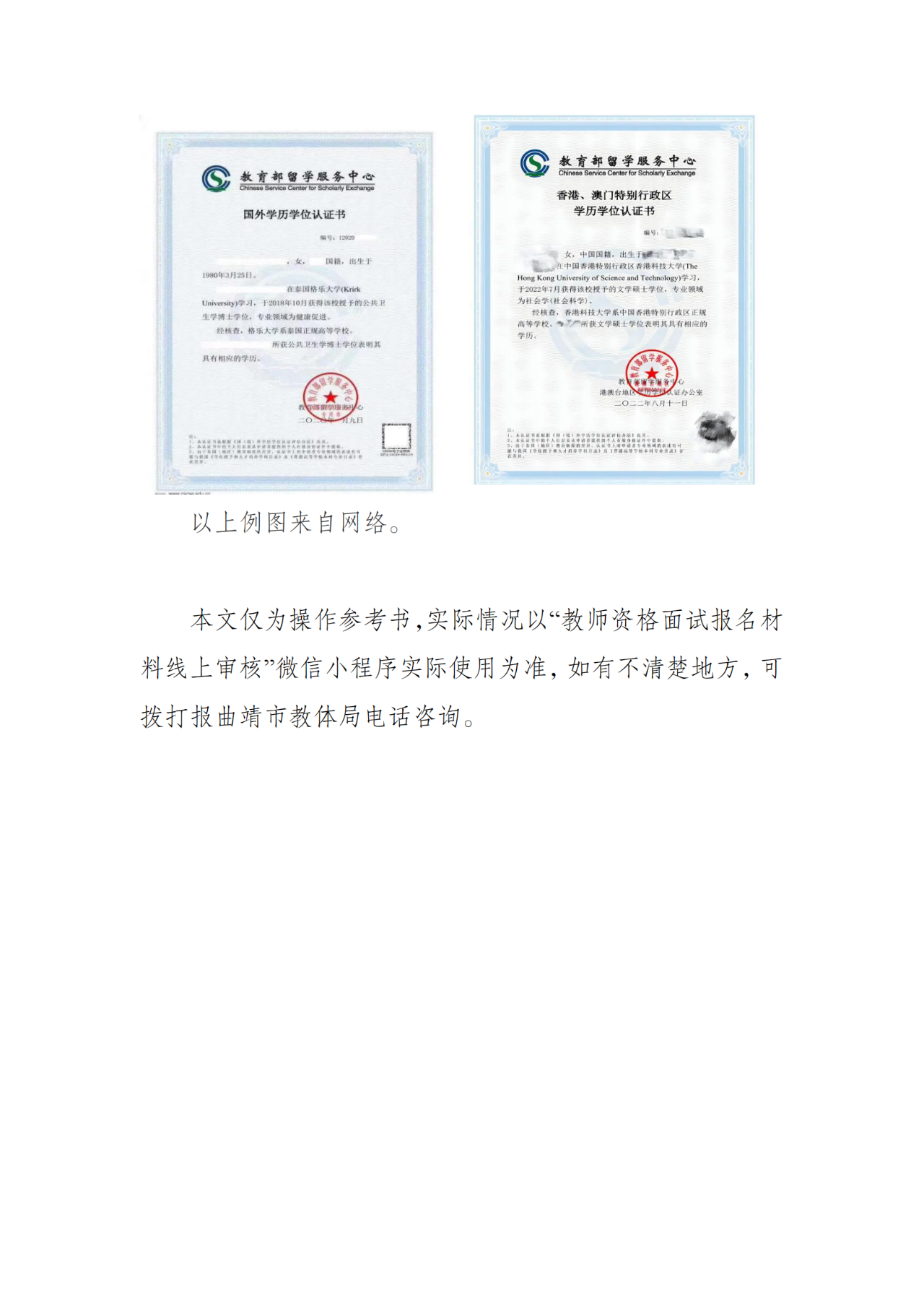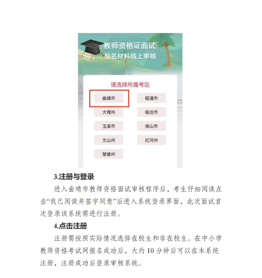 (四)此公告審核確認方式僅限于曲靖市2024上半年中小學教師資格考試(面試)的報名審核確認。云南省其他考區(qū)的確認方式及有關(guān)事項,請以云南省統(tǒng)一發(fā)布的公告為準。