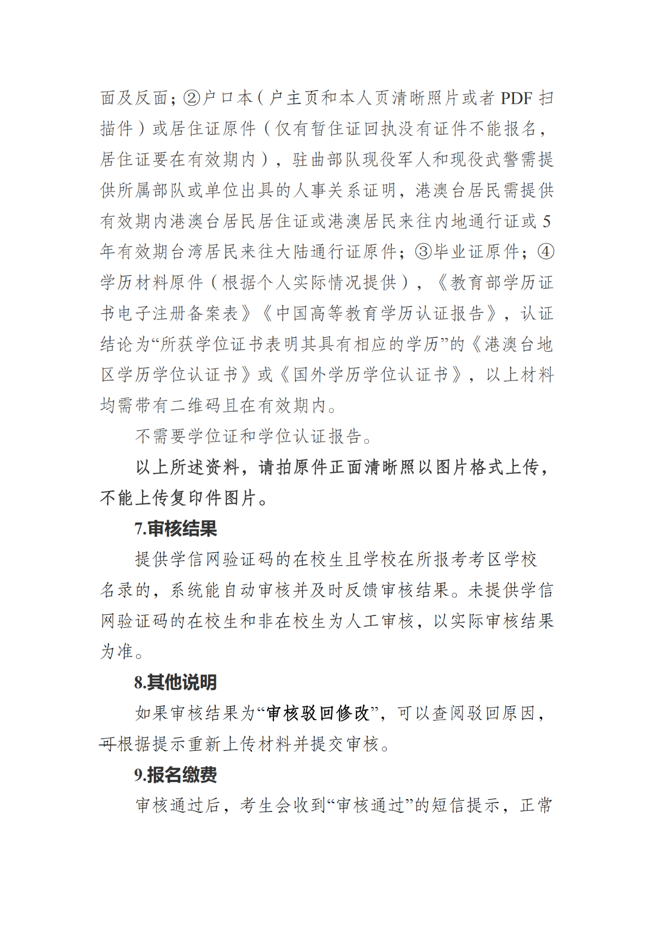 (二)請考生本著對自身負責的態(tài)度,首先要弄清楚報考人員范圍,其次按要求上傳材料,確保上傳材料完整、真實、有效、齊全、準確、清晰。如不屬于本考區(qū)范圍人員或因上傳材料不符合要求造成審核不通過的,責任自行承擔。
