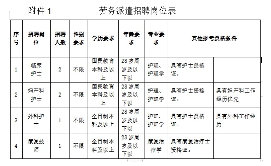 公開招聘勞務(wù)派遣類醫(yī)療護(hù)理工作人員,崗位要求詳見《勞務(wù)派遣招聘崗位表》。