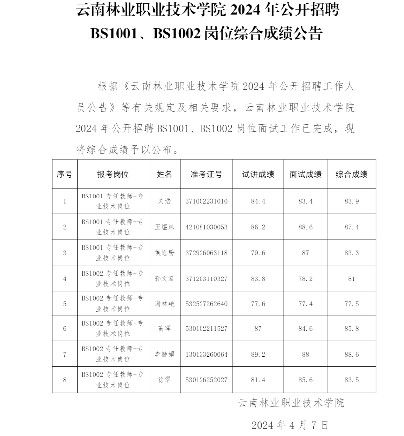 云南林業(yè)職業(yè)技術(shù)學(xué)院2024年公開招聘BS1001、BS1002崗位綜合成績公告