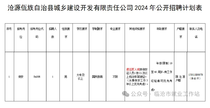 滄源佤族自治縣城鄉(xiāng)建設(shè)開發(fā)有限責(zé)任公司公開招聘1名專業(yè)人才,保安人員1名。招聘計(jì)劃詳見《滄源佤族自治縣城鄉(xiāng)建設(shè)開發(fā)有限責(zé)任公司2024年公開招聘計(jì)劃表》附件。