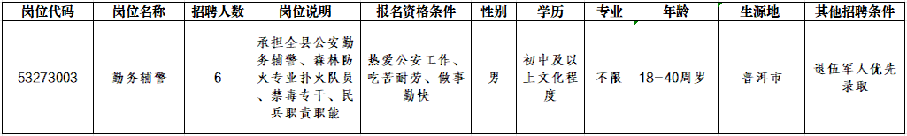 本次招錄共設(shè)1個(gè)崗位,男性6人。詳情請(qǐng)關(guān)注“西盟警方”微信公眾號(hào)查詢。