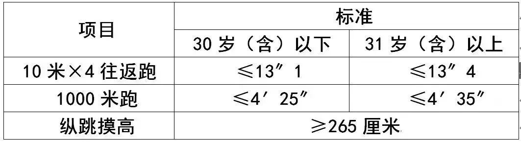 體能測(cè)評(píng)按照公安部《關(guān)于印發(fā)公安機(jī)關(guān)錄用人民警察體能測(cè)評(píng)項(xiàng)目和標(biāo)準(zhǔn)(暫行)的通知》及其所附標(biāo)準(zhǔn)開展。