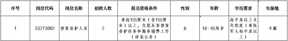 本次招聘的留置看護人員不具有人民警察和國家公務員身份,不納入編制管理,不行使人民警察職權(quán)。招聘人數(shù):2人(女性)。
