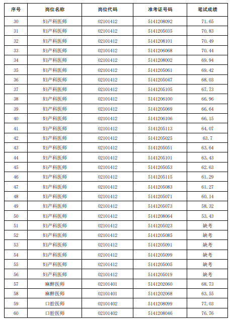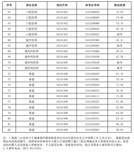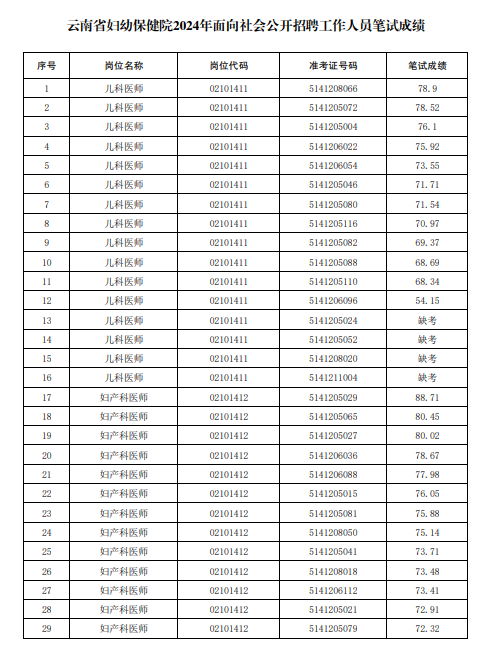 云南省婦幼保健院2024年面向社會(huì)公開(kāi)招聘工作人員筆試成績(jī)