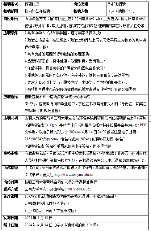 2024年云南大學(xué)生態(tài)與環(huán)境學(xué)院科研助理崗位招聘公告