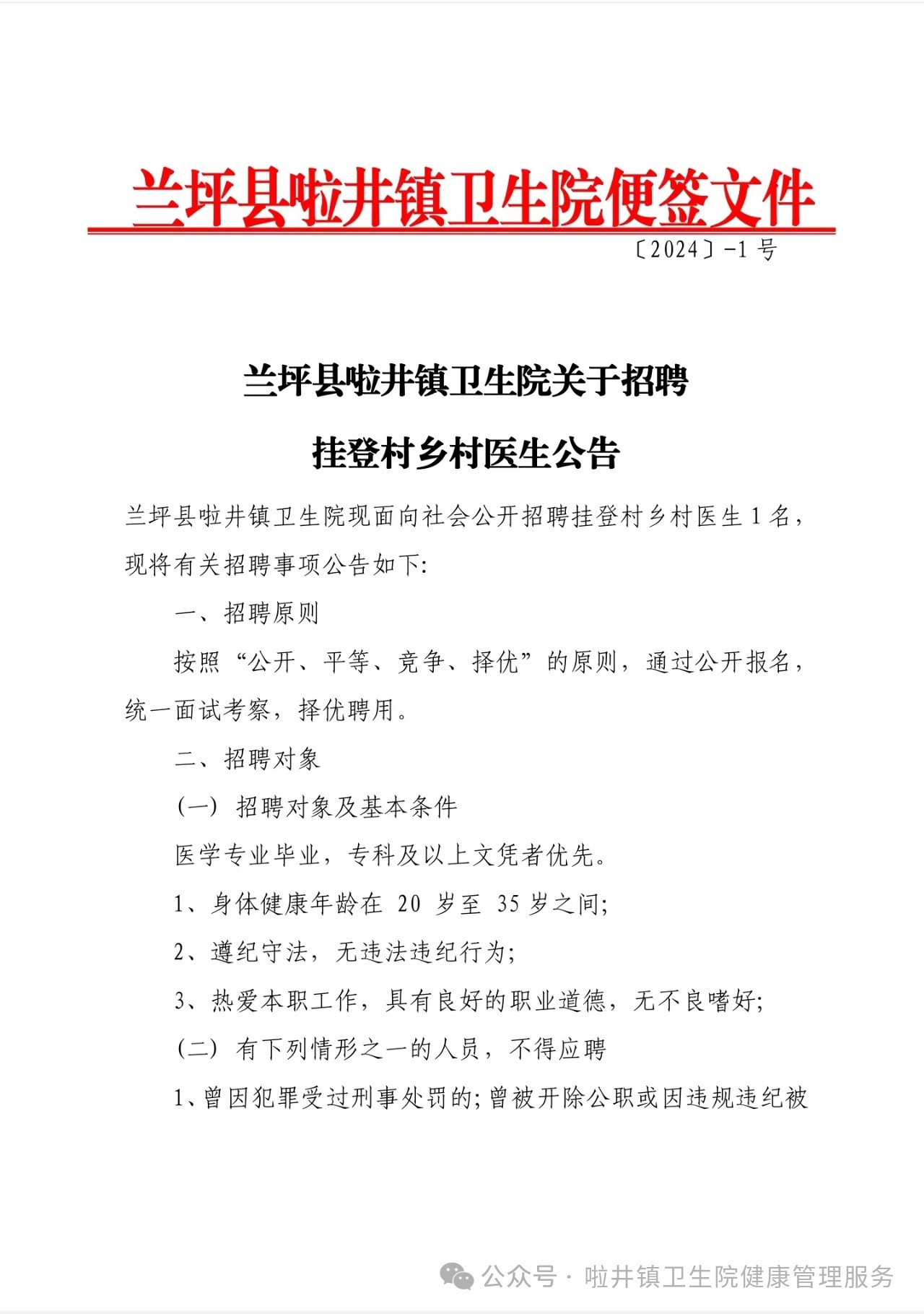 2024年怒江州蘭坪縣啦井鎮(zhèn)衛(wèi)生院招聘掛登鄉(xiāng)村醫(yī)生公告
