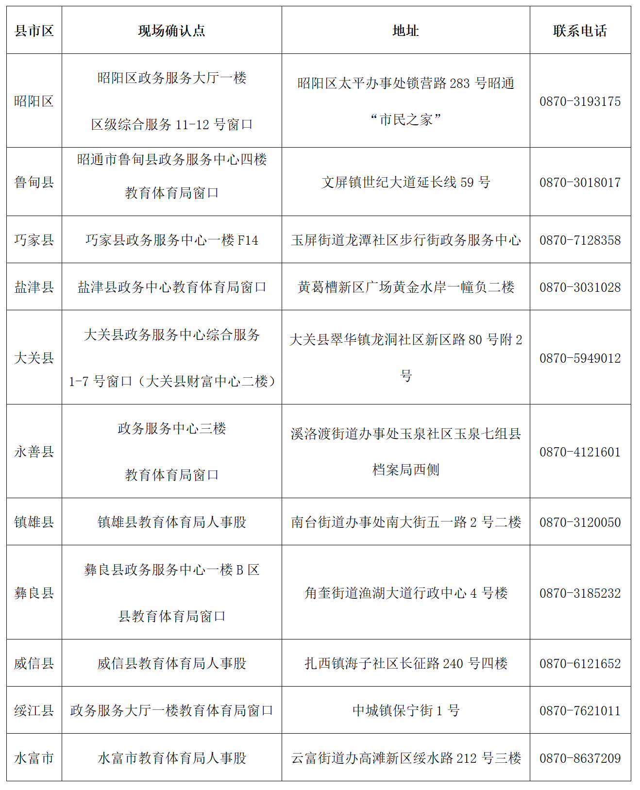 考生注意事項(xiàng):現(xiàn)場(chǎng)確認(rèn)須到申請(qǐng)人戶籍或居住所在地縣(市、區(qū))政務(wù)中心教育體育窗口或教育體育局進(jìn)行確認(rèn)。咨詢電話如下: