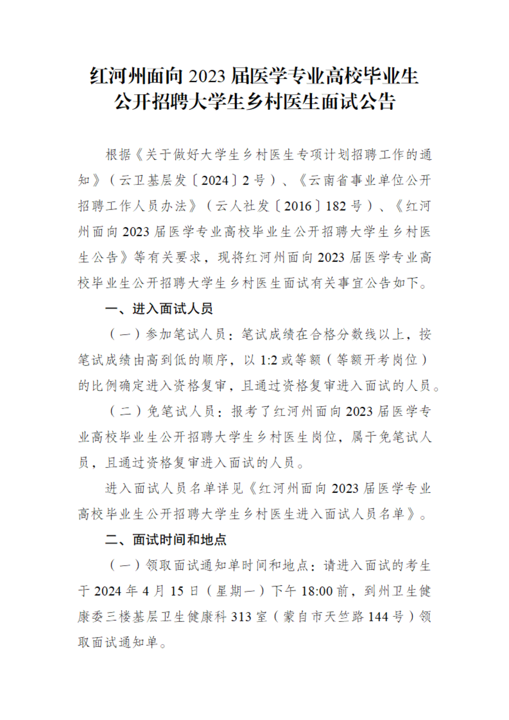 紅河州面向2023屆醫(yī)學(xué)專業(yè)高校畢業(yè)生公開招聘大學(xué)生鄉(xiāng)村醫(yī)生面試公告