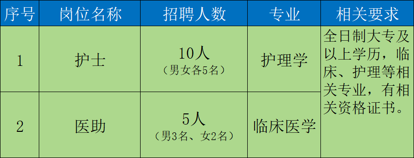 1.護士:護士需持有護士資格證;年齡32歲以下;全日制大專及以上學(xué)歷各屆畢業(yè)生、應(yīng)屆畢業(yè)生;身心健康,愛崗敬業(yè),服從領(lǐng)導(dǎo)安排。