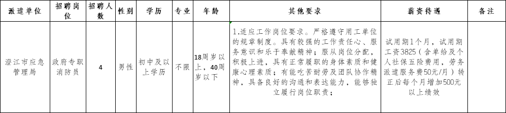 根據(jù)《澄江市應(yīng)急管理局勞務(wù)派遣人員招聘公告》要求已補(bǔ)充相應(yīng)崗位人員,現(xiàn)因部分崗位人員空缺,澄江市應(yīng)急管理局委托澄江市啟澄人力資源有限責(zé)任公司面向社會(huì)公開招聘勞務(wù)派遣人員4名,招聘相關(guān)事項(xiàng)如下: