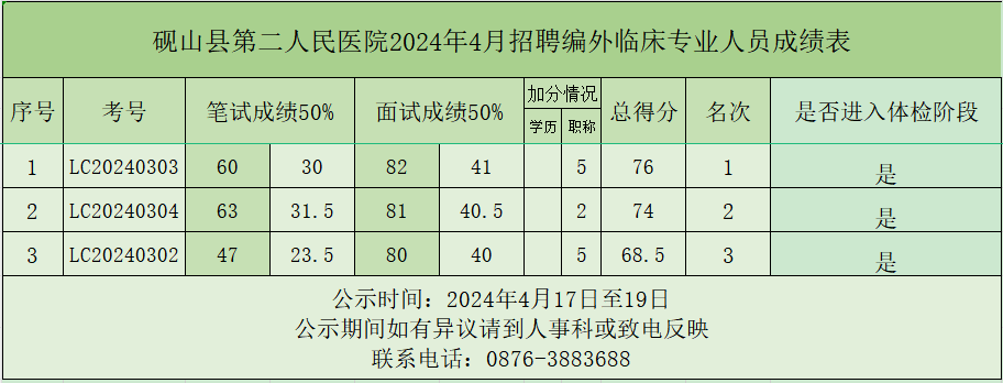 硯山縣第二人民醫(yī)院 2024年4月招聘編外臨床專業(yè)人員成績公示 來源:https://mp.weixin.qq.com/s/S52V1jxIQS7itY_L9RHPmA