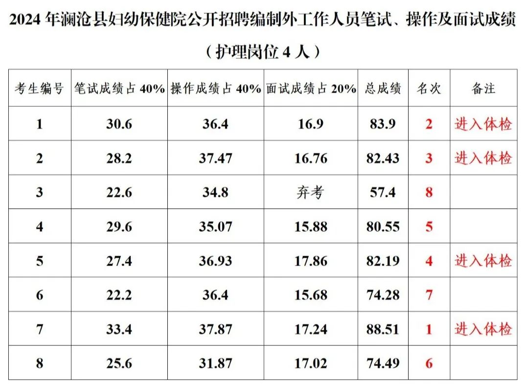 根據(jù)《瀾滄縣緊密型醫(yī)共體成員單位(婦幼保健院)2024年人才招聘公告》,4月11日、4月17日,瀾滄縣婦幼保健院在1號樓六樓進行了人才招聘綜合筆試、技能操作考試及面試,現(xiàn)將2024年瀾滄縣婦幼保健院第一批公開招聘編制外工作人員成績公示如下: