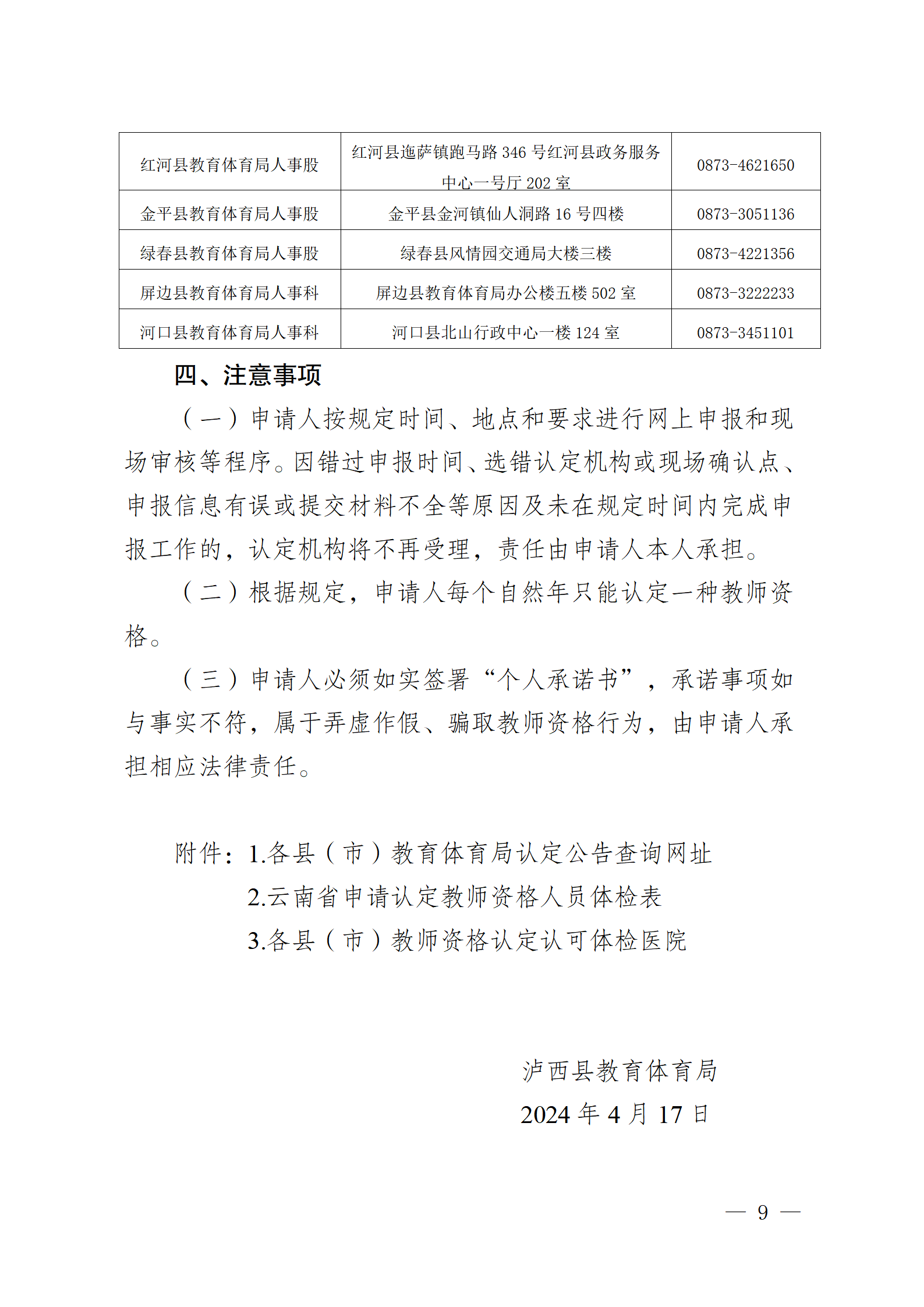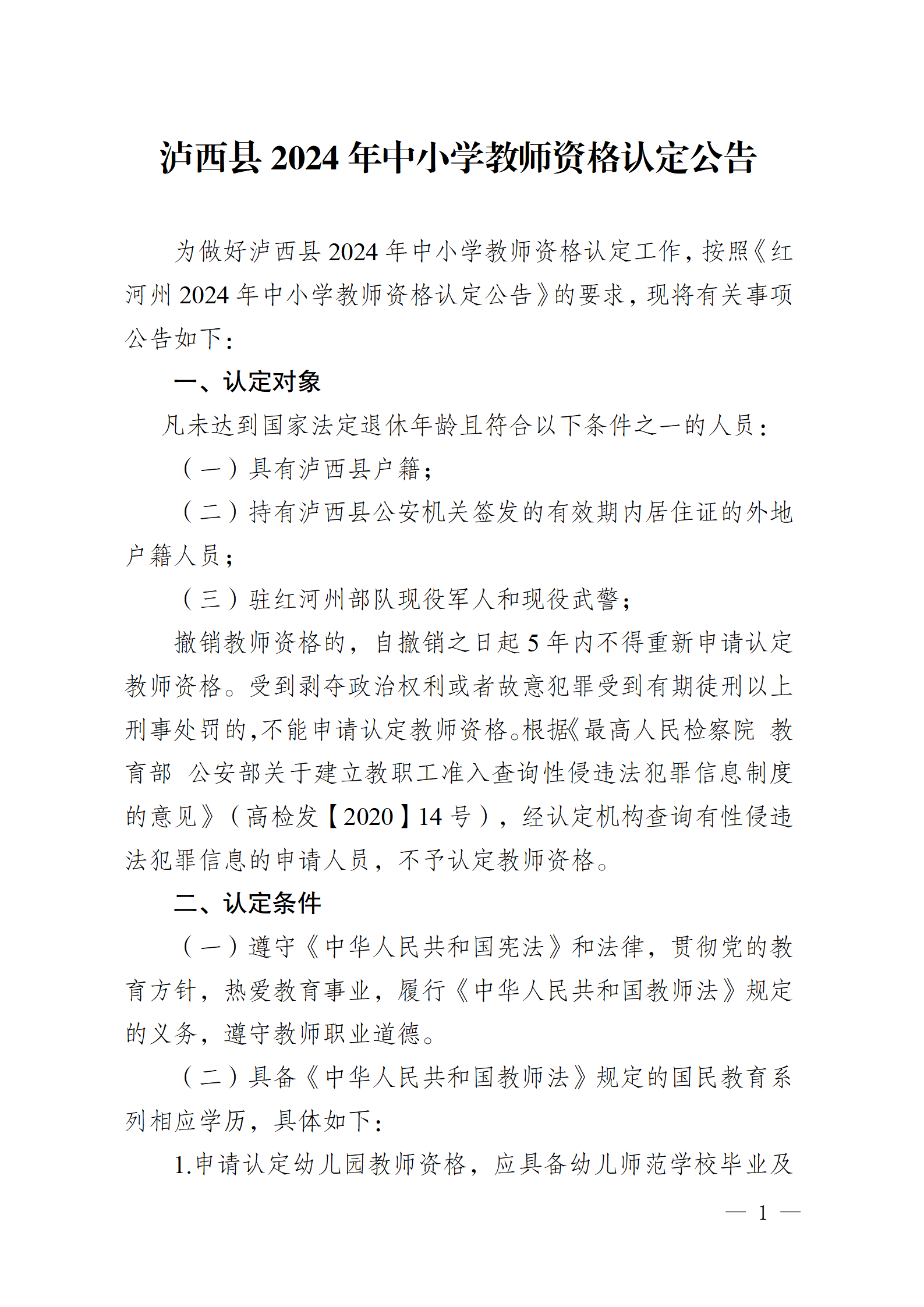 瀘西縣2024年中小學(xué)教師資格認定公告