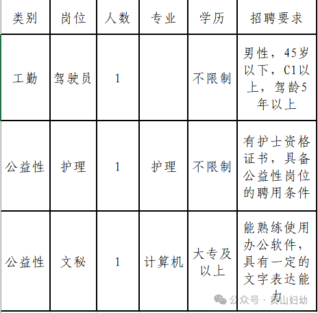 招聘3人:工勤人員:招駕駛員1名;公益性崗位:招護理專業(yè)人員1名及文秘專業(yè)1名。詳見下表: