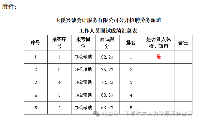 附件:玉溪興誠會計(jì)服務(wù)有限公司公開招聘勞務(wù)派遣工作人員公告面試成績匯總表