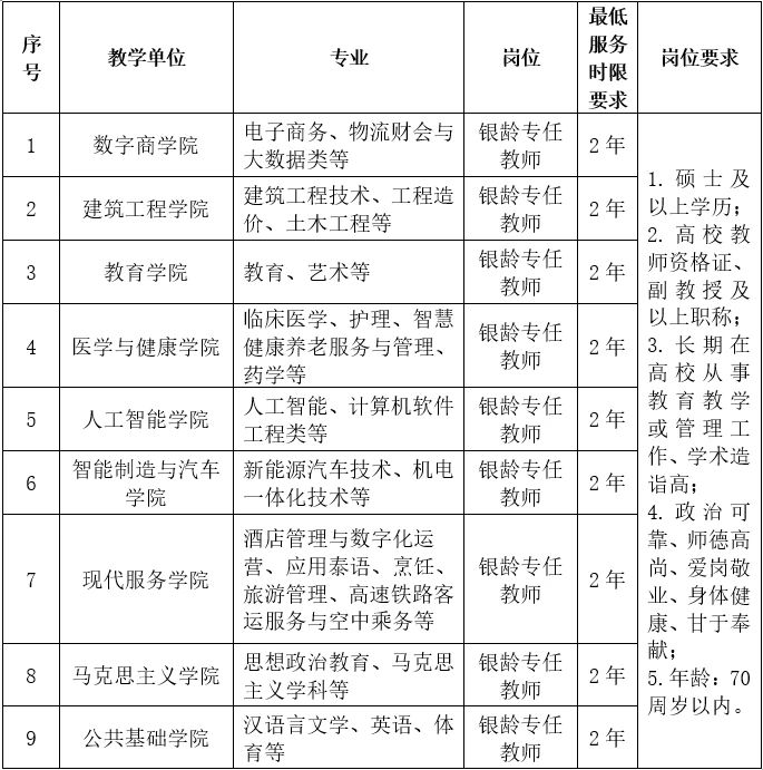 2024年我校“銀齡教師”招募計(jì)劃具體教學(xué)單位及專業(yè)如下: