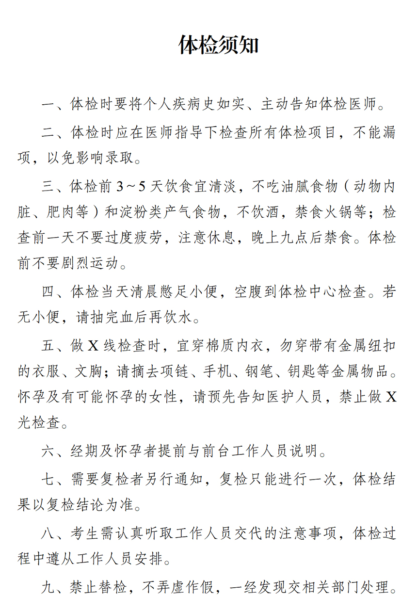 (六)體檢注意事項:由醫(yī)療衛(wèi)生部門提供,詳見《體檢須知》。未按規(guī)定時間要求參加體檢的,視為自動放棄。
