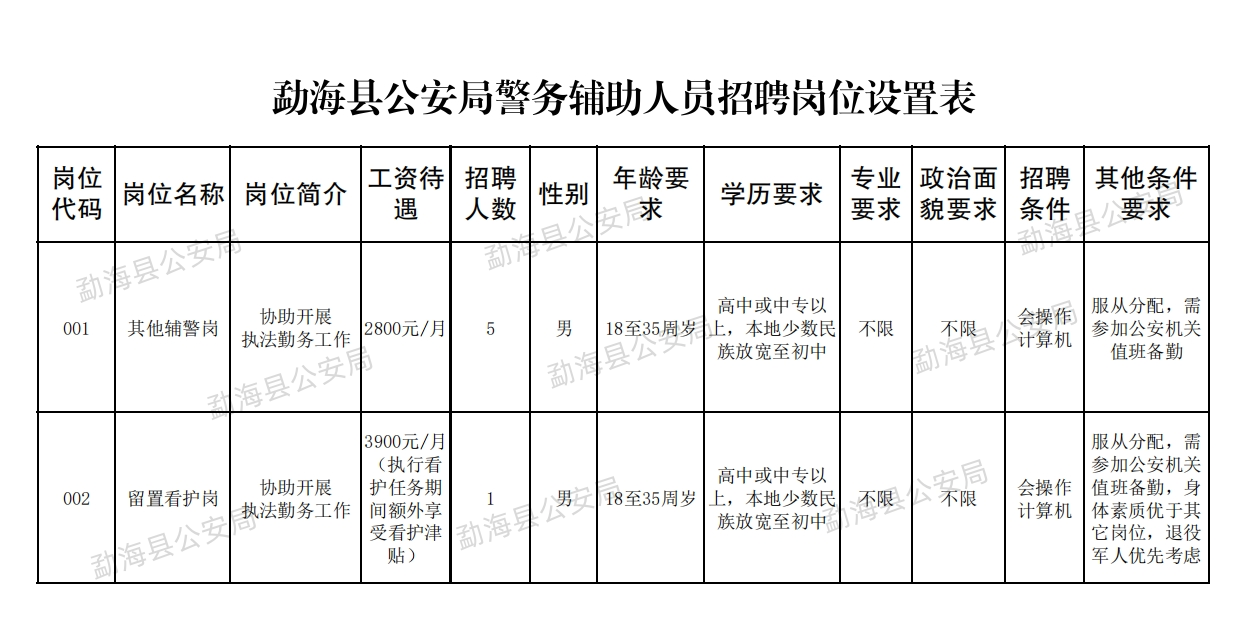 根據(jù)工作需要,勐海縣公安局現(xiàn)面向社會公開招聘一批警務輔助人員(以下簡稱“輔警”),有關事項公告如下: