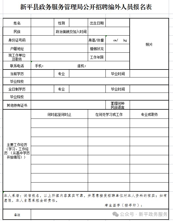 4.附:新平縣政務(wù)服務(wù)管理局公開(kāi)招聘編外人員報(bào)名表。