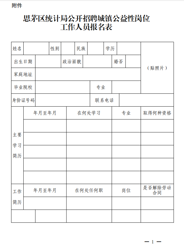 附件:《思茅區(qū)統(tǒng)計局公開招聘城鎮(zhèn)公益性崗位工作人員報名表》