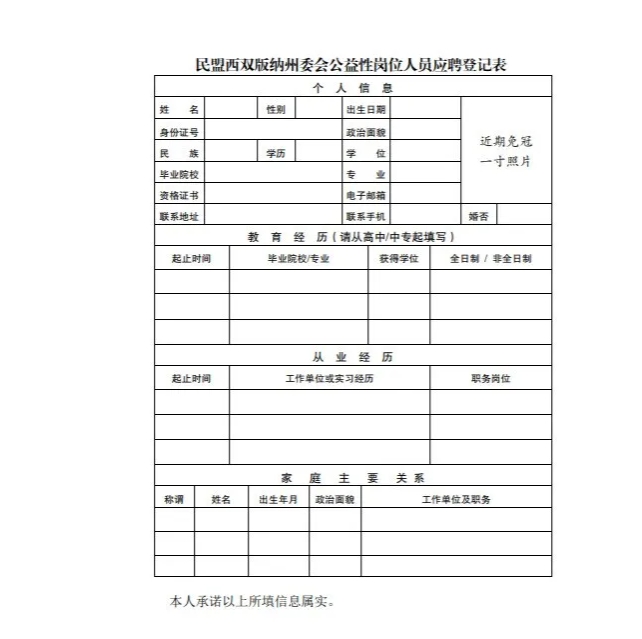 3.報名方式:將《民盟西雙版納州委會公益性崗位人員應(yīng)聘登記表》(見附件)發(fā)送至mmxsbn@163.com郵箱。