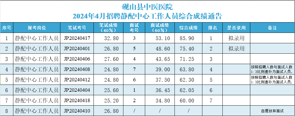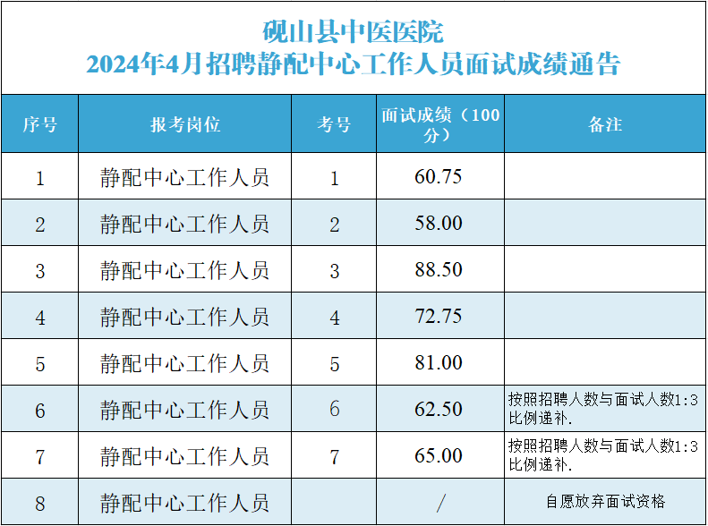 硯山縣中醫(yī)醫(yī)院2024年4月招聘靜配中心工作人員面試成績(jī)及綜合成績(jī)通告