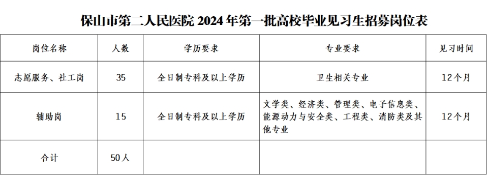 本次招募崗位為保山市第二人民醫(yī)院2024年第一批次高校畢業(yè)見習(xí)生,招募人數(shù)50人,崗位具體要求詳見《保山市第二人民醫(yī)院2024年第一批見習(xí)生崗位表》。