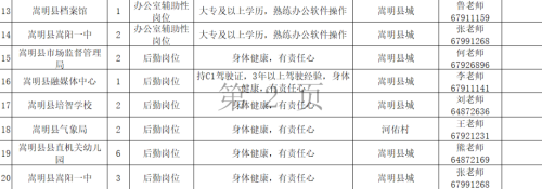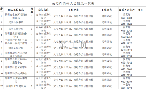 招聘具體事宜請(qǐng)咨詢用人單位。符合公益性崗位上崗條件的個(gè)人也可以到嵩明縣政務(wù)服務(wù)中心2號(hào)樓2樓人社23號(hào)窗口進(jìn)行公益性崗位求職登記,詳詢羅老師:0871-67917444。