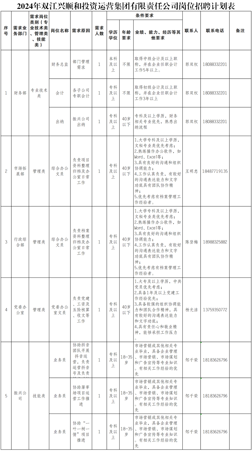 本次招聘計(jì)劃面向社會(huì)招聘集團(tuán)公司及下屬子公司工作人員共計(jì)9名,具體招聘條件詳見(jiàn)《興順和集團(tuán)公司2024年度員工崗位招聘計(jì)劃表》(附件1)