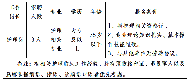 備注:有相關(guān)護理臨床工作經(jīng)驗、持有預(yù)防接種證、退役軍人以及熟練掌握緬語、傣語、景頗語口語者優(yōu)先考慮。