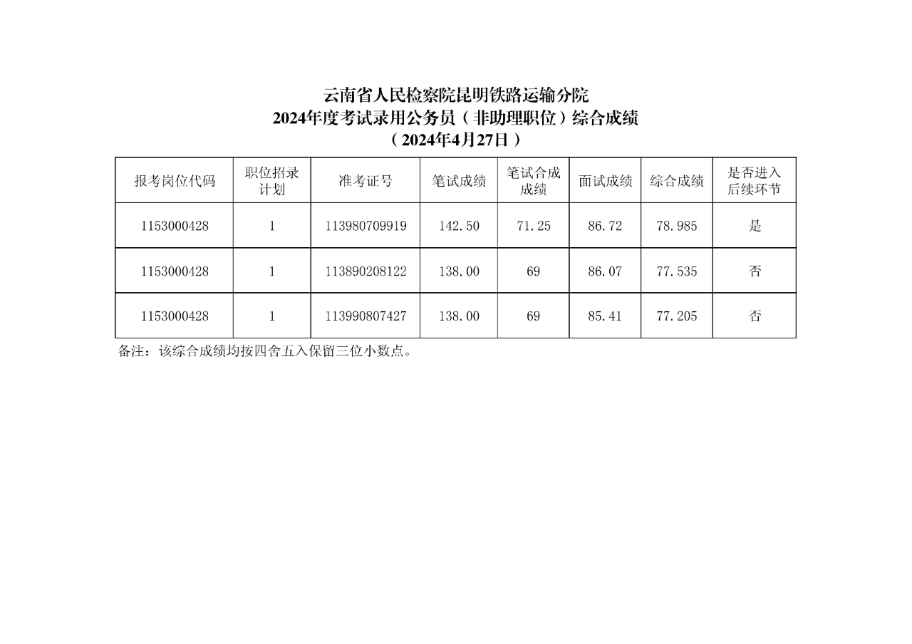 2024年云南省人民檢察院昆明鐵路運輸分院考試錄用公務(wù)員(非助理職位)綜合成績