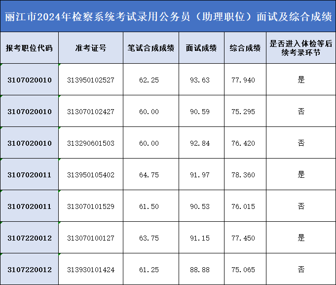 麗江市檢察系統(tǒng)2024年度考試錄用公務(wù)員(助理職位)成績公布