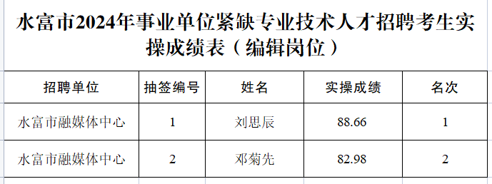 根據(jù)《昭通市2024年事業(yè)單位公開招聘優(yōu)秀緊缺專業(yè)技術(shù)人才實(shí)施辦法》和《水富市2024年事業(yè)單位公開招聘優(yōu)秀緊缺專業(yè)技術(shù)人才通告》的有關(guān)要求,水富市2024年事業(yè)單位公開招聘優(yōu)秀緊缺專業(yè)技術(shù)人才實(shí)操工作已于4月28日上午完成,現(xiàn)將實(shí)操成績(jī)予以公示,公示期為5個(gè)工作日。