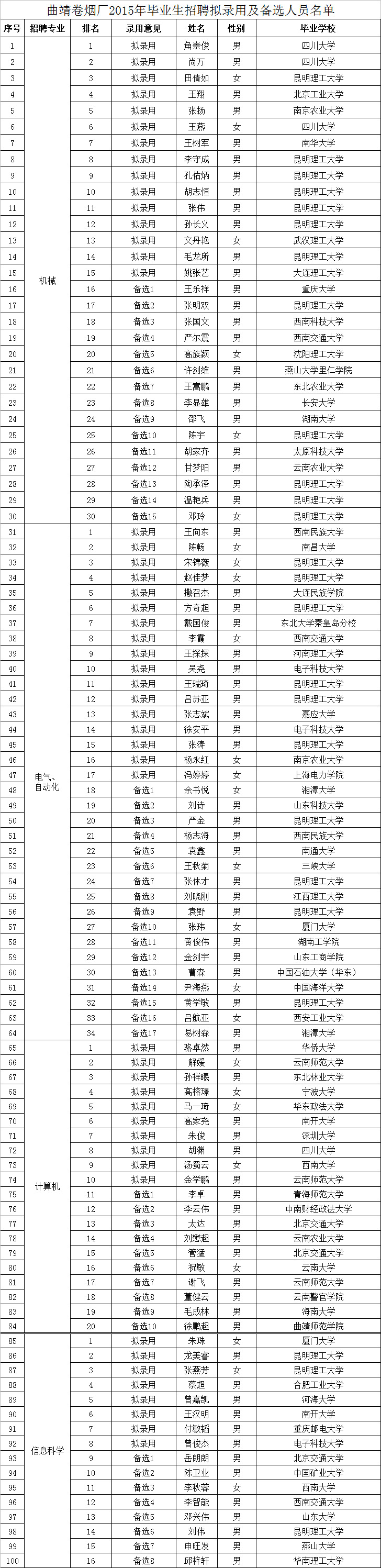 按照紅云紅河集團2015年畢業(yè)生招聘計劃及相關(guān)安排,集團招聘的各項程序已完成,根據(jù)考試成績排名,現(xiàn)將曲靖卷煙廠擬錄用和備選人員名單進行公示(若擬錄用人員放棄簽約,則按備選意見依次遞選錄用),詳見附件。