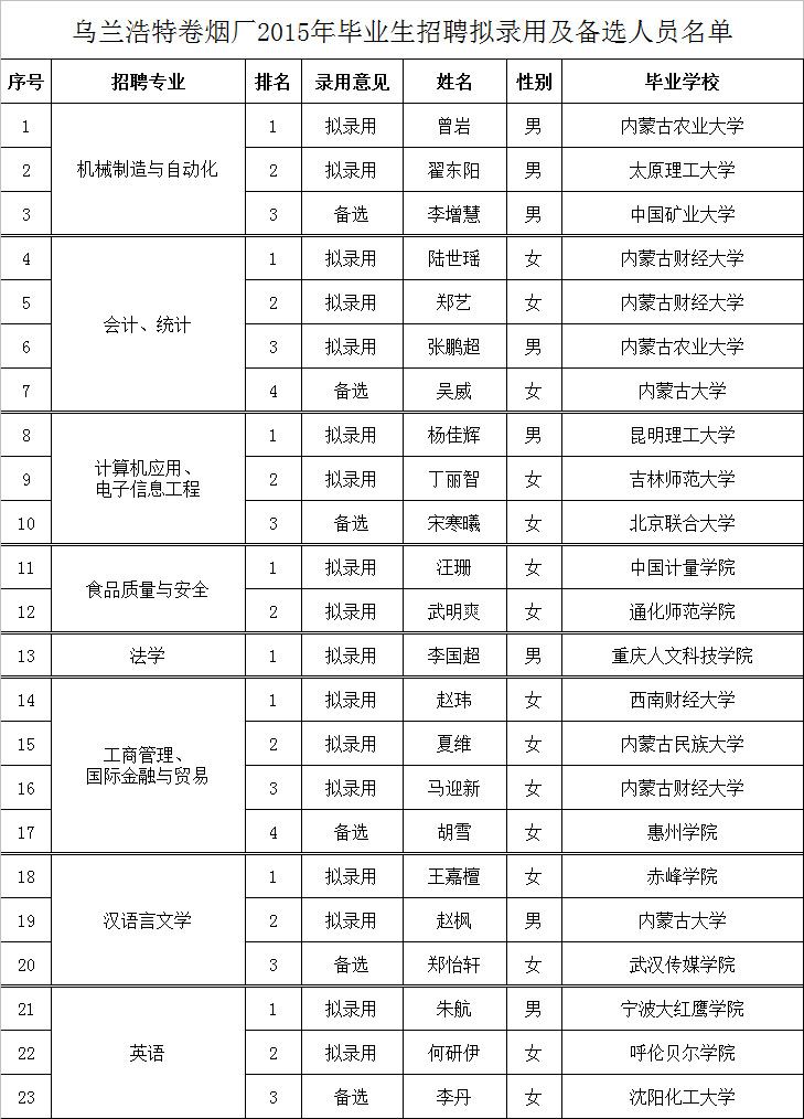 烏蘭浩特卷煙廠擬錄用和備選人員公示