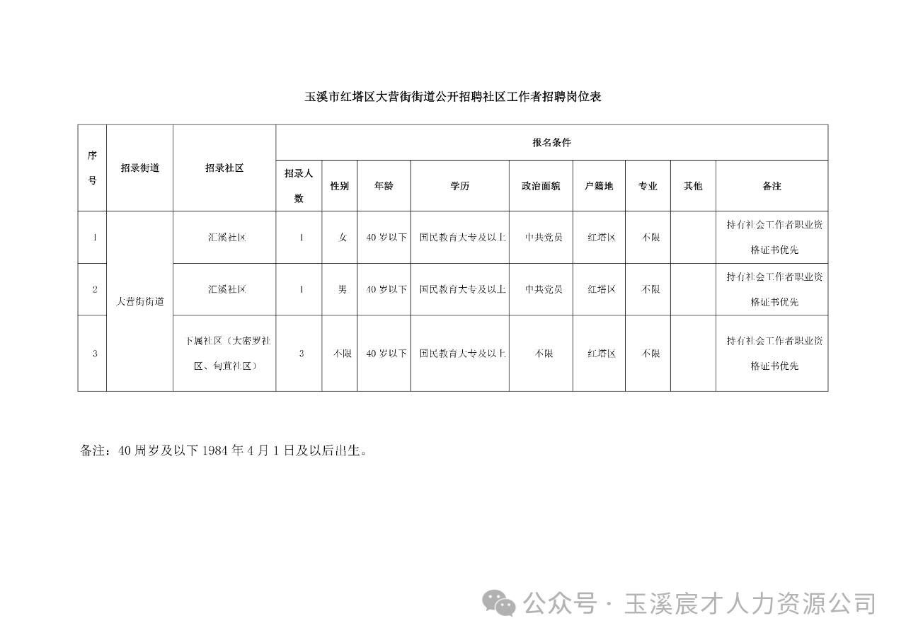 因工作需要,玉溪市紅塔區(qū)大營街街道委托玉溪宸才人力資源咨詢管理有限公司面向社會公開招聘社區(qū)工作者5名,現(xiàn)將有關(guān)事項公告如下: