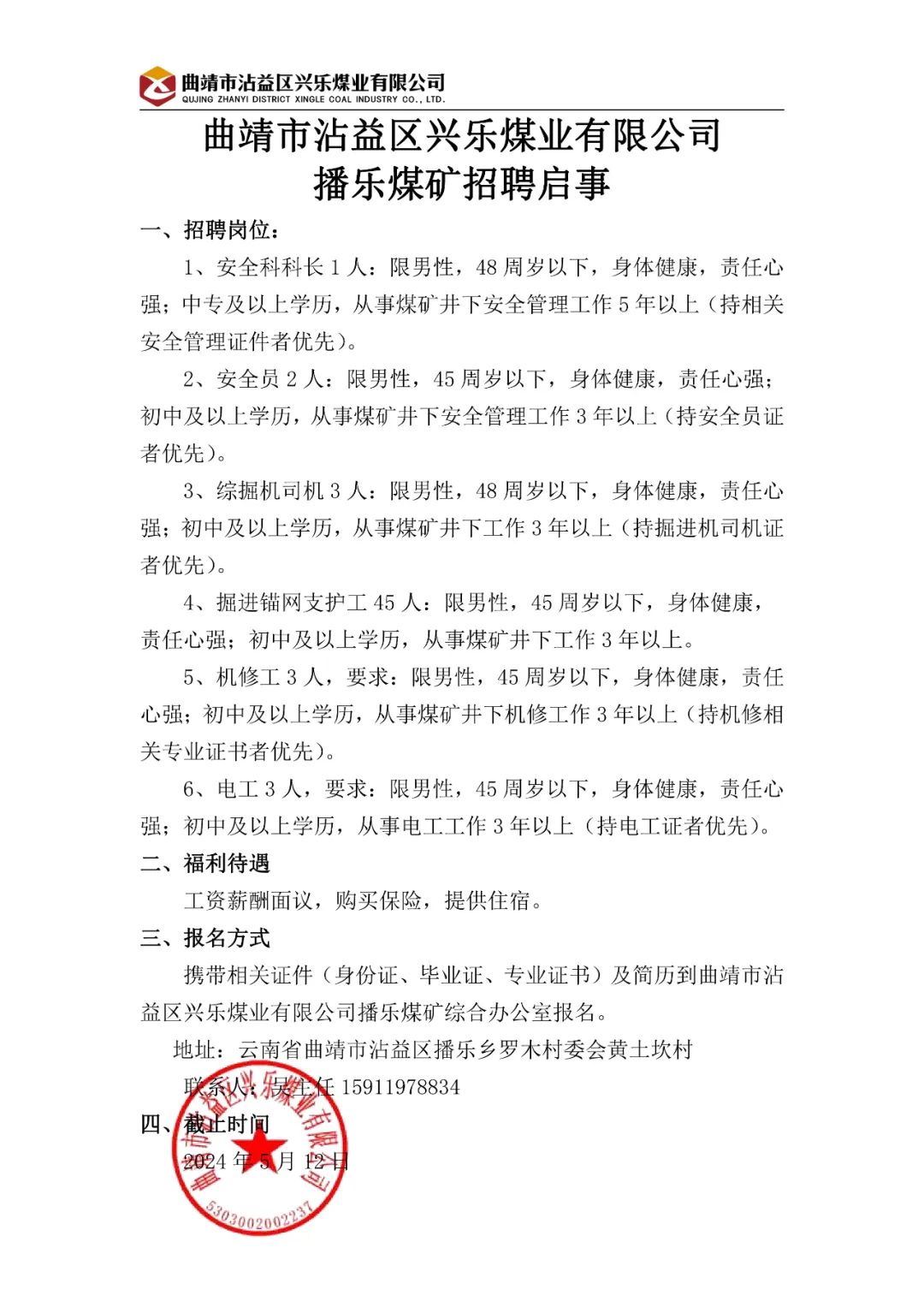 2024年曲靖市沾益區(qū)興樂煤業(yè)有限公司播樂煤礦招聘啟事