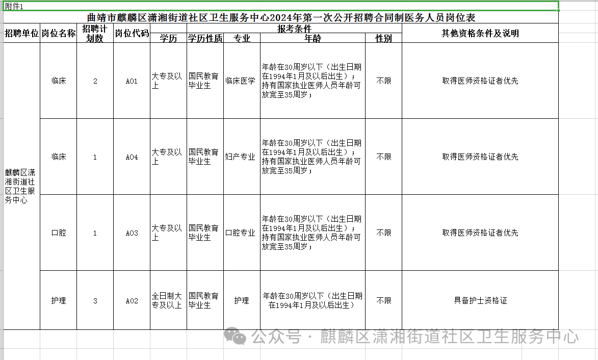 附件1. 曲靖市麒麟?yún)^(qū)瀟湘街道社區(qū)衛(wèi)生服務中心2024年第一次公開招聘合同制醫(yī)務人員崗位表