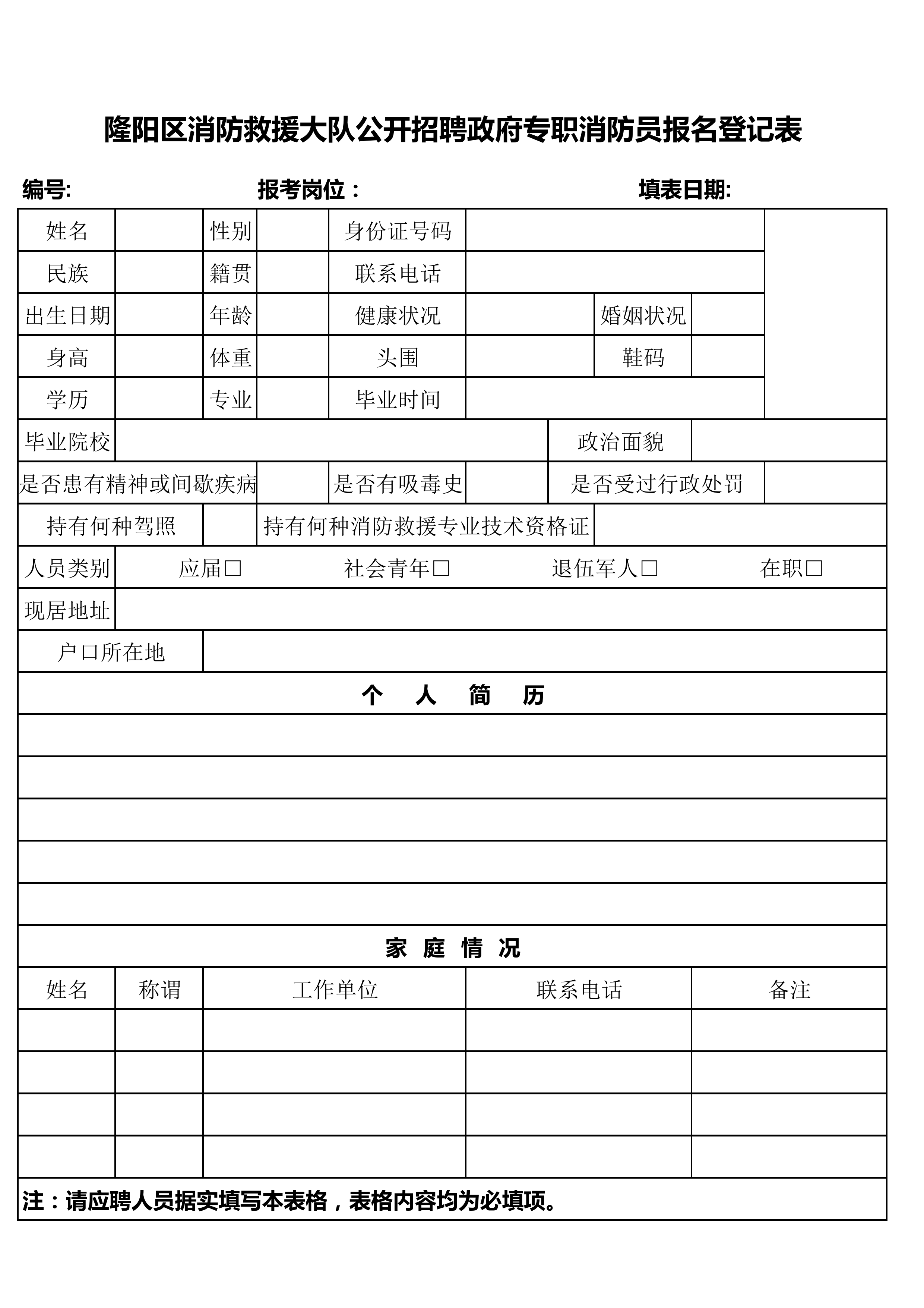 附:隆陽區(qū)消防救援大隊(duì)公開招聘政府專職消防員報(bào)名登記表